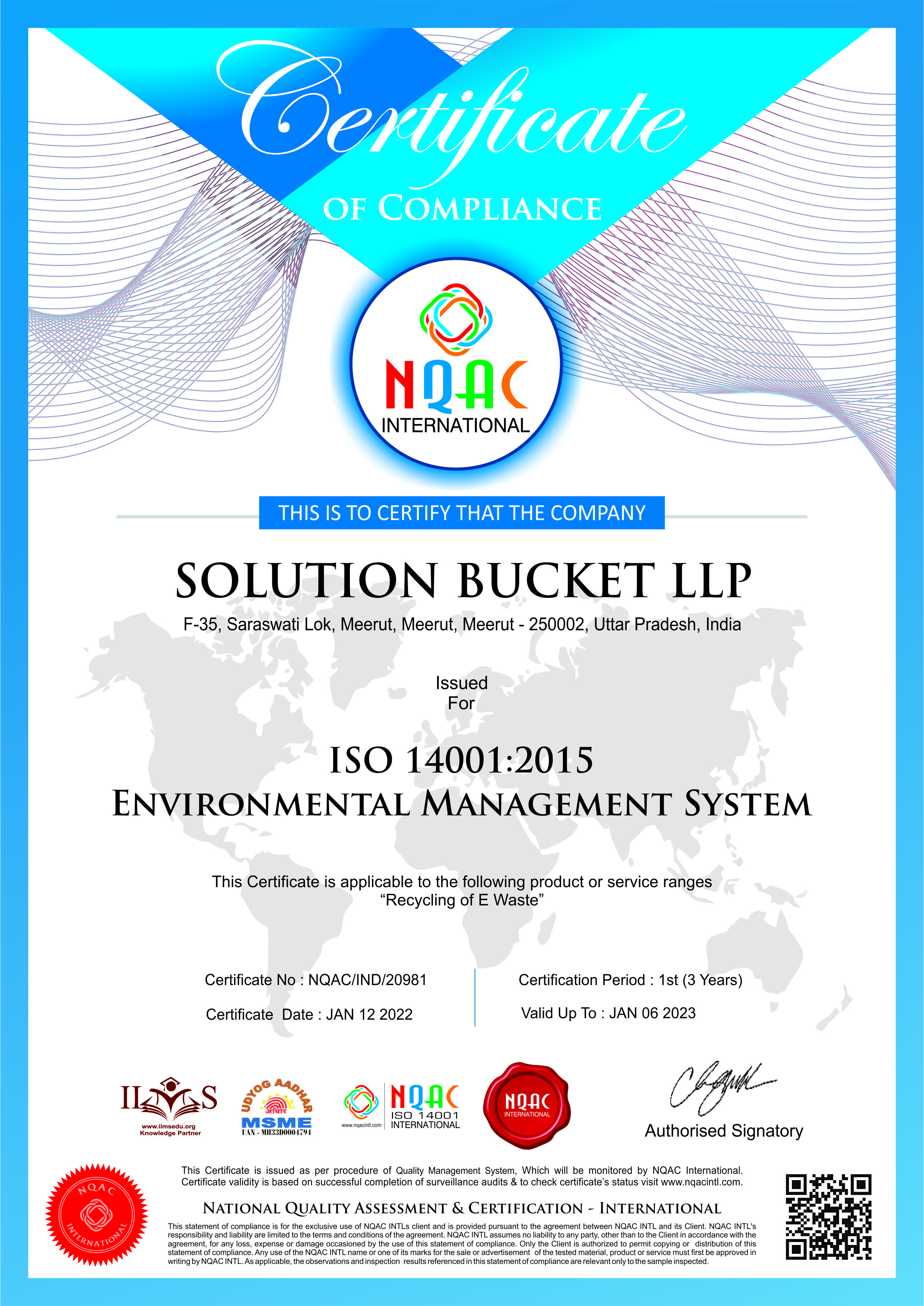 Solution Bucket LLP for your E-Waste collection and recycling, we oversee end to end E-Waste administration; connect with us and handover you're E-Waste for safe and scientific way of recycling process. We will also provide E-Waste collection certificate.