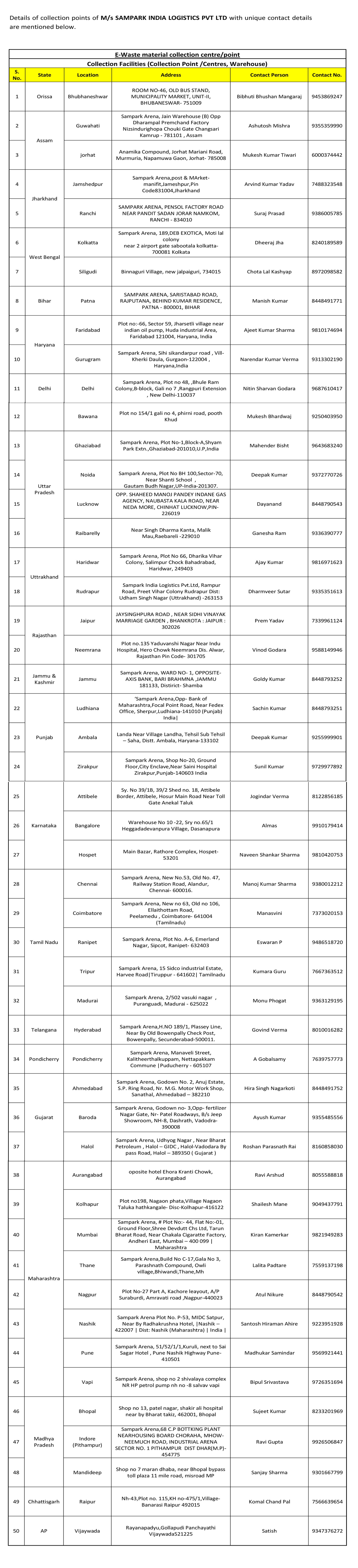 • M/s SOLUTION BUCKET LLPwill collect the E-Waste on behalf of producer from PAN India Level, & their logistics partner M/s SAMPARK INDIA LOGISTICS PVT LTD registered at“Sampark Arena” 52, Jaidev Park, Punjabi Bagh East, New Delhi-110026will transport the E-Waste collected to M/sECO SAVIOUR E-WASTE MANAGEMENT PRIVATE LIMITEDrecycling plant facility situated at H.No. C-351,352,Ansal Pioneer, Industrial Park, Bilaspur, Manesar, Gurugram,Haryana,122051.